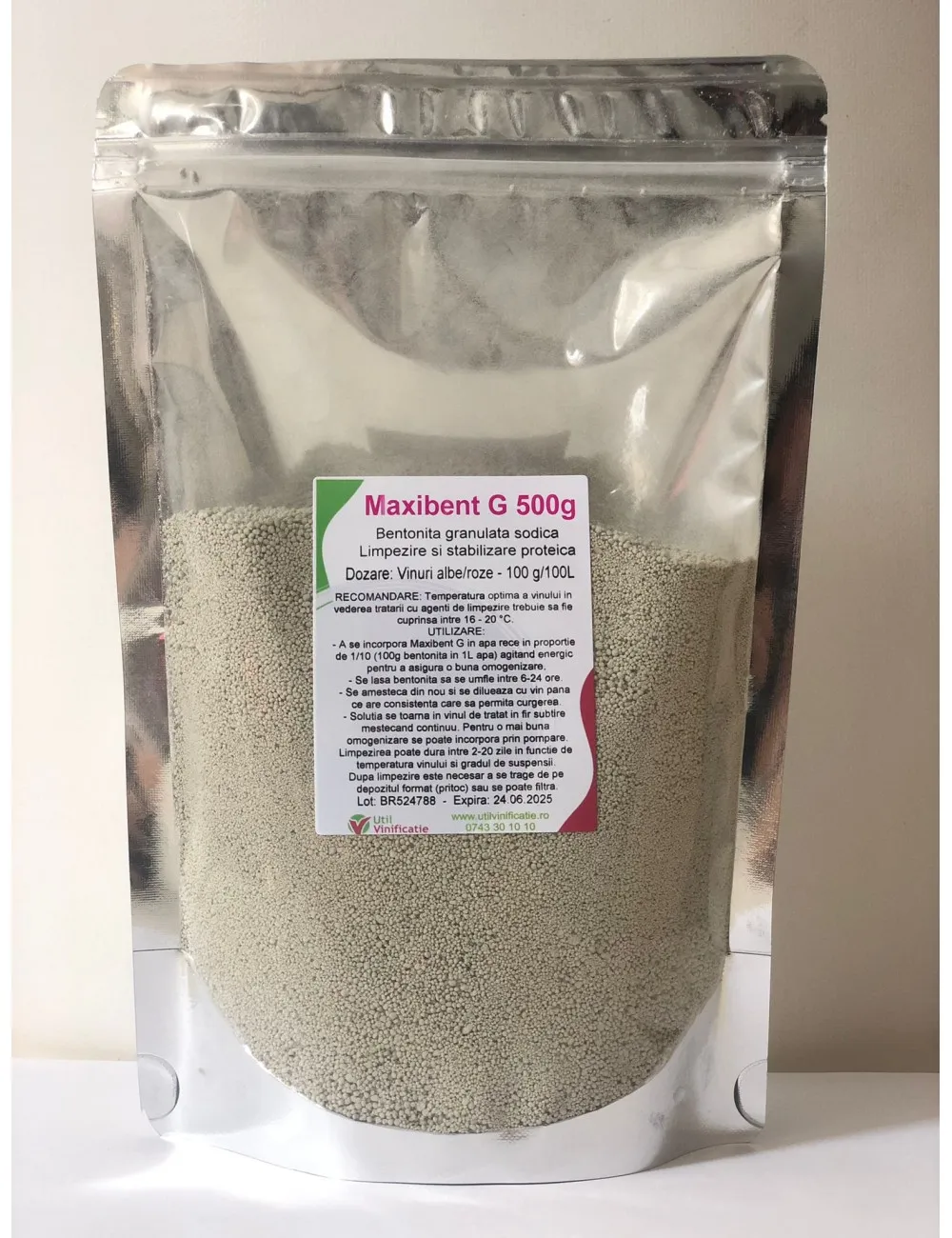 Bentonita sodica granulata cu putere mare de limpezire, deproteinizanta si clarifianta. Dozare: 10 - 100 g/100 L.